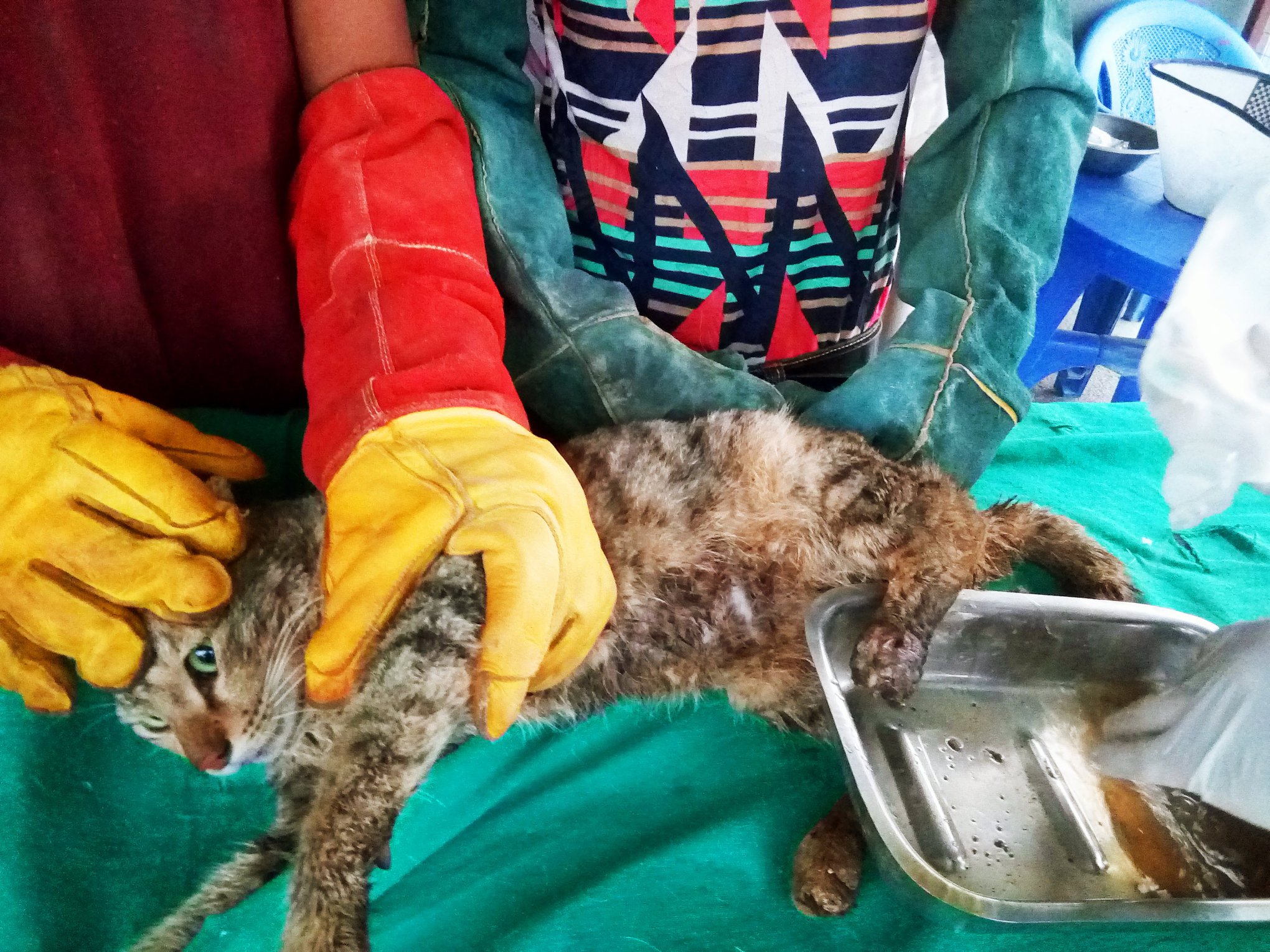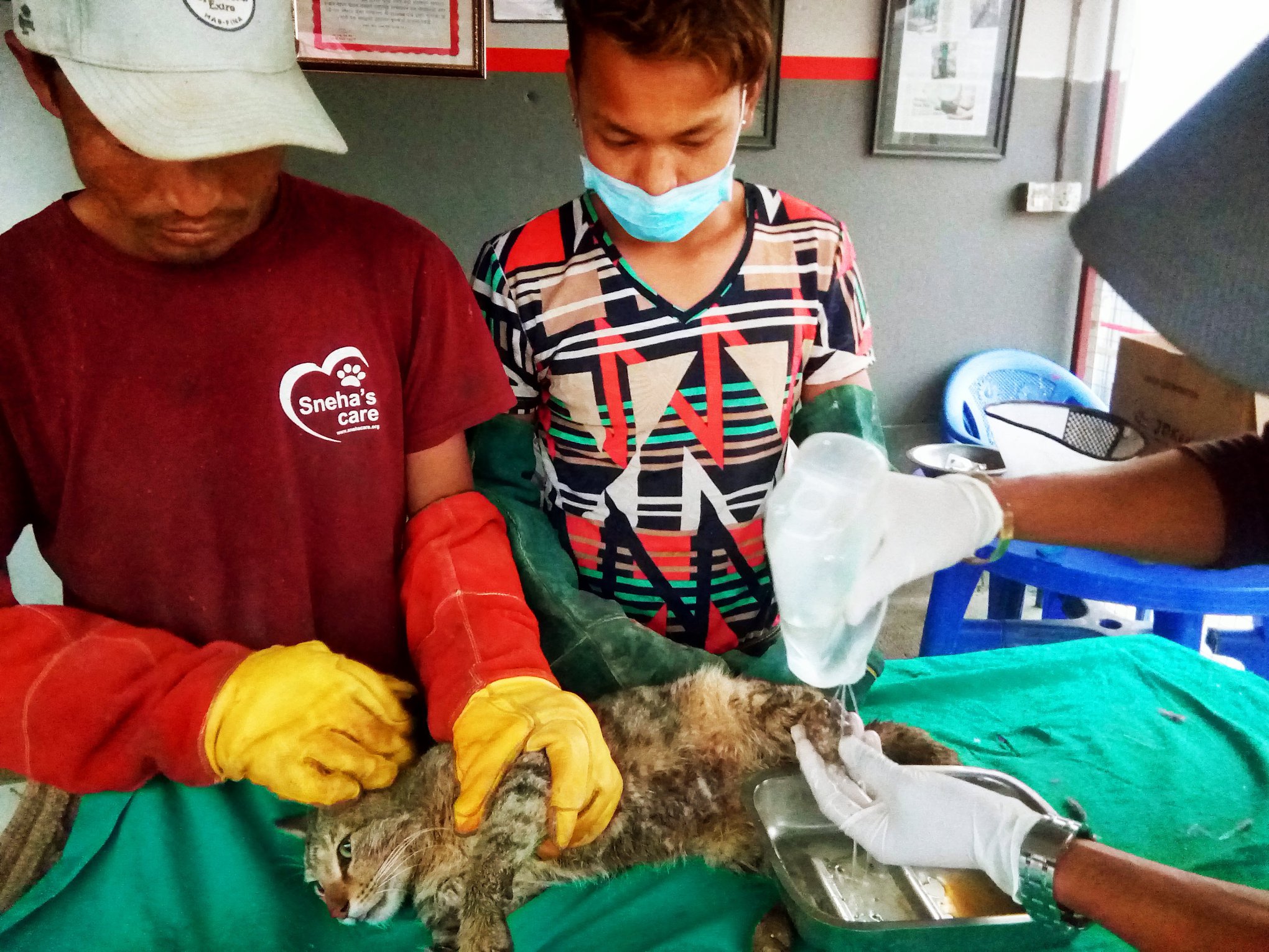 This cat had fallen from a top of a building in Basantapur. The fall had severely injured its leg. Thank you to Rajiv who continuously looked after it and informed us. It is under treatment at the shelter now. We pray for its speedy recovery.