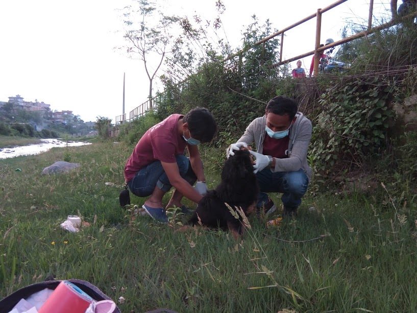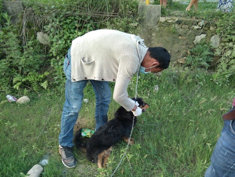 This dog was found with a Chain on the neck which means he was a pet. He was badly tied by a cloth on his neck, maggots wounded on his back and paralyzed. How can people be so cruel to throw a pet in a river putting him inside a bag with a chain on him? We have no more words to write about this owner who abandoned him. Thank you Prativa Dhungel for reporting us this rescue.