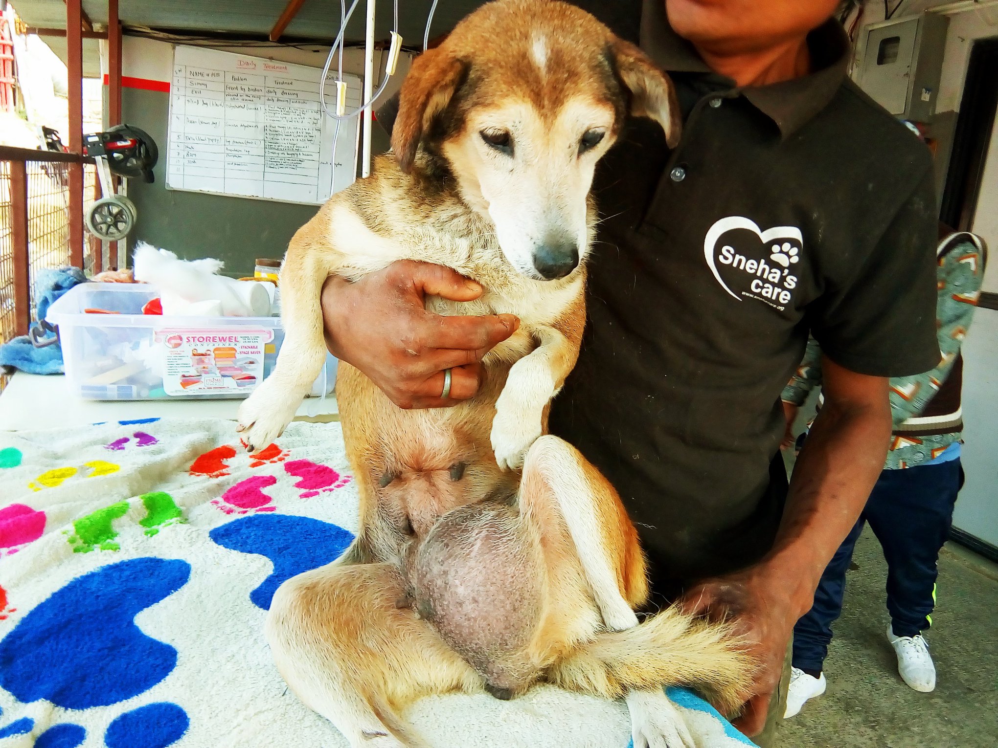 This is Lola. Lola suffers from a mammary tumor in her abdomen area, which has made her quite weak. She is unable to move much because of the heavy weight of the tumor. Maximum percentages of female dogs that are not spayed suffer from tumors like these in their lifetime. Even though most of these tumors are benign, it weakens a dog, diminishes their health and can be quite painful.