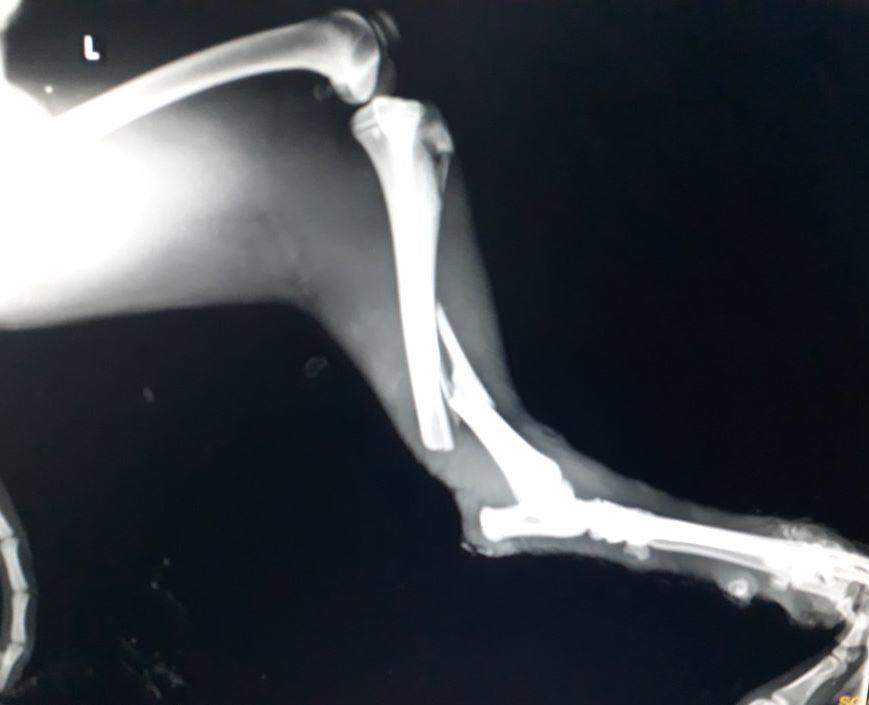 My x-ray report clearly explained tibia and fibula fracture of my left hind limb. My limb is swollen giving rise to unexplainable pain. The doctor at the shelter has already started my treatment and I truly want to walk normally again.