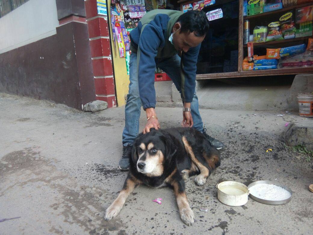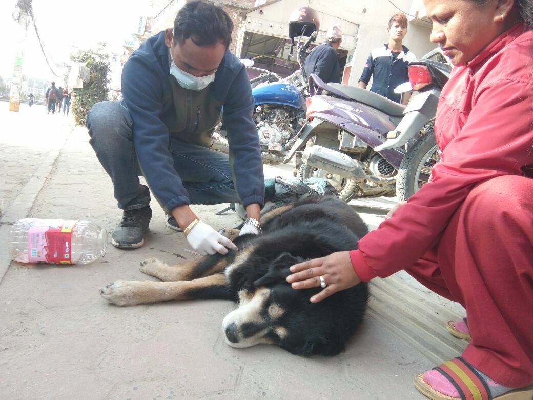 The case doesn’t finish here. He was hit by a taxi of a heartless taxi driver who ran away after hitting him. We were informed about him by Mr. Shiva Subedi as he say the dog in pain at Baneshwor. We went there to see his condition and did necessary treatment for the dog. He doesn’t have major injury but yes, the trauma of being abandoned is not going to clear from his mind easily.