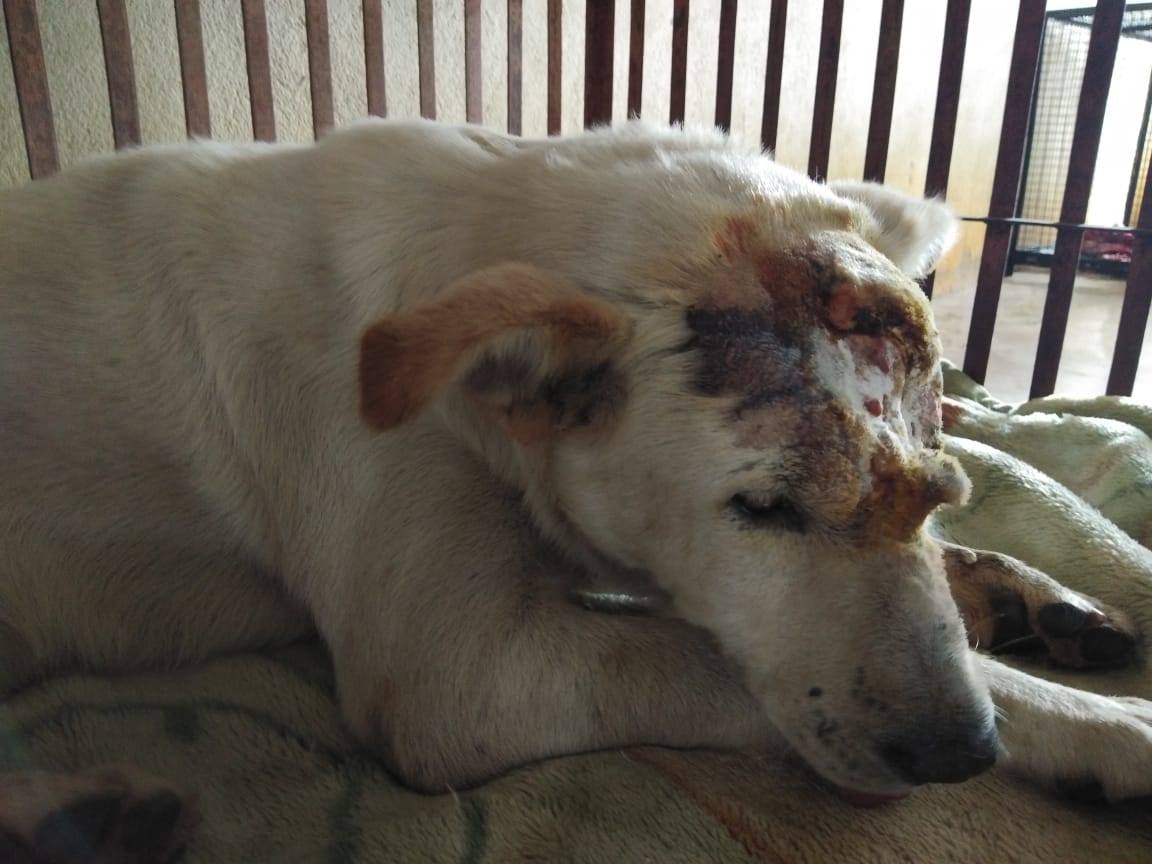 Why are we as human beings, the so called superior beings unable to understand that we should be spreading compassion and care towards other loving beings rather than hatred. We rescued and brought Peastachu (name given by us) to our shelter. He has a severe wound on his forehead with one eye totally slashed by a cruel human.